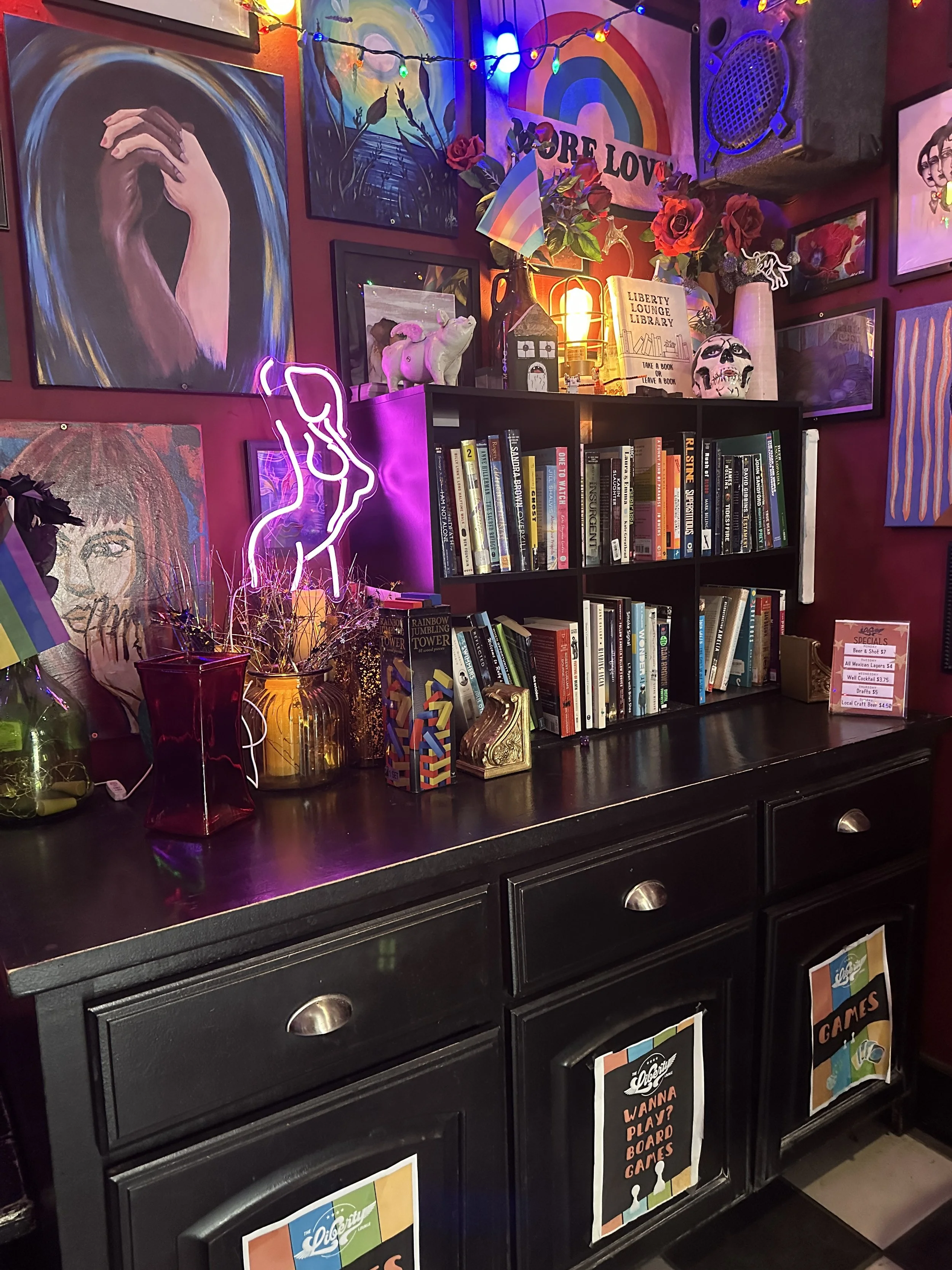 We keep things lively! Swing by for weekly excitement like Trivia Nights and Fridayβs Drag Race Watch Party, plus monthly events like our Lit Liberty Book Club. Stay in the loopβfollow us on Instagram & Facebook for all the latest shenanigans!